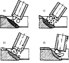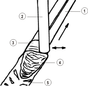 The electrode is positioned vertically or at a slight angle relative to the surface of the metal panel. It is inclined slightly in the direction of welding. The visible arc length, i.e. the distance between the edge of the crater and the surface of the workpiece, should thereby be about the same as the diameter of the core rod. Basic electrodes must be welded with a very short arc (distance = 0.5 x core rod diameter). To ensure this, they must be guided at a steeper angle than rutile electrodes. In most positions, the welder creates a stringer bead or weaves slightly with a gouge width that gets larger as it moves up. Weave beads are drawn across the entire width of the gouge only in position PF. Welding is usually a dragging motion; the electrode is pushed in position PF only.